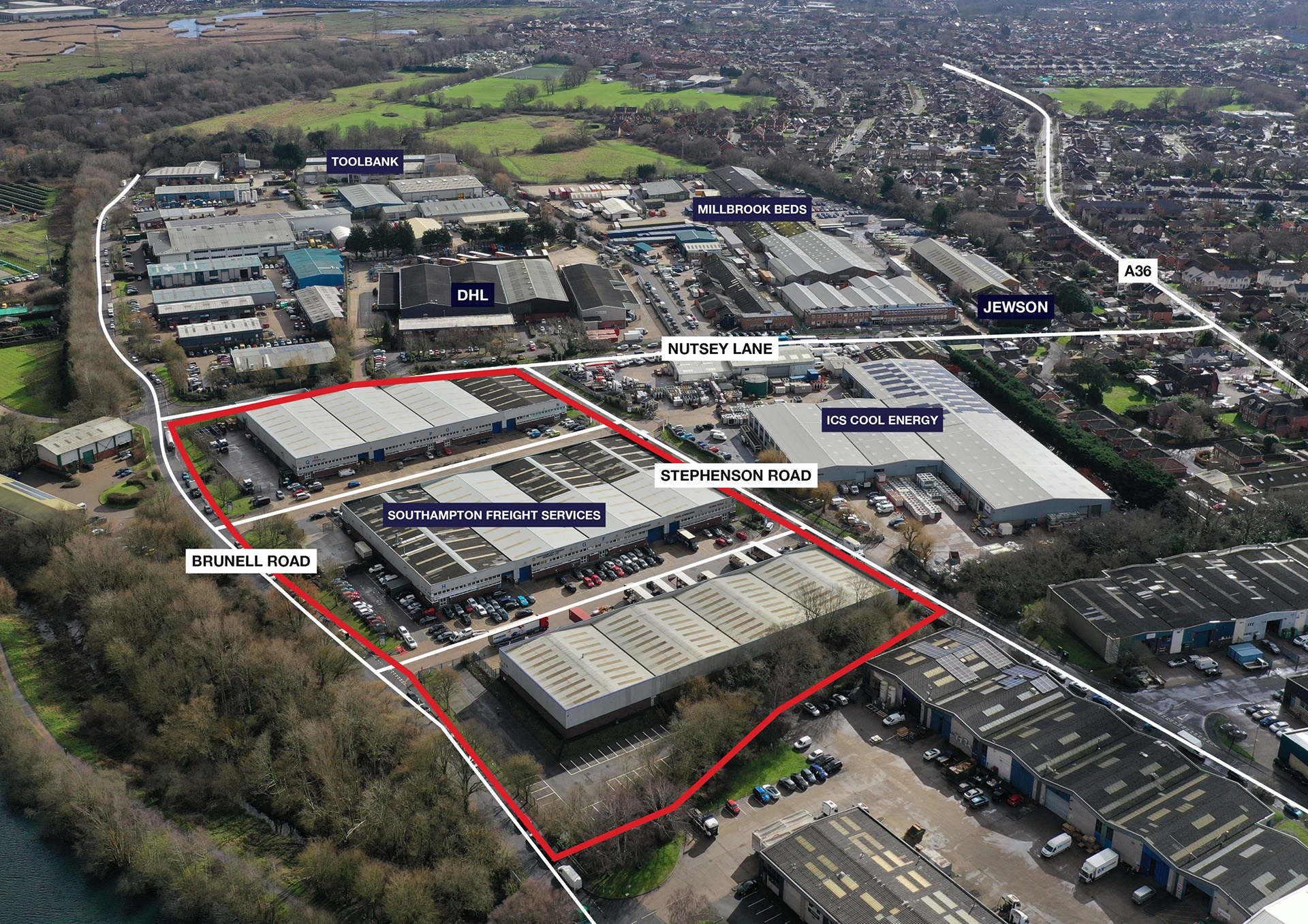 Calmore Industrial Estate is accessed via the A36 Salisbury Road which links to junction 2 of the M27 to the North and Totton Town Centre and Redbridge Road to the South.
